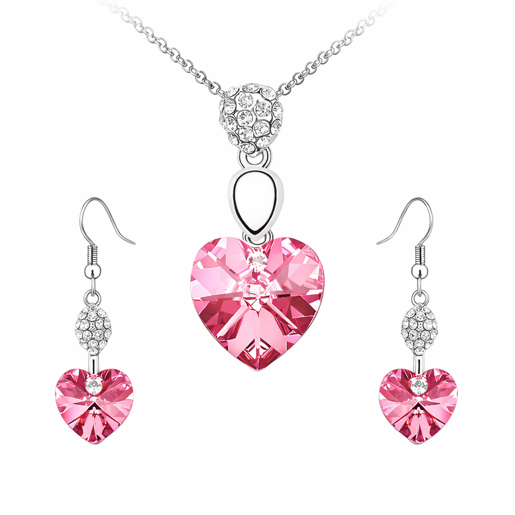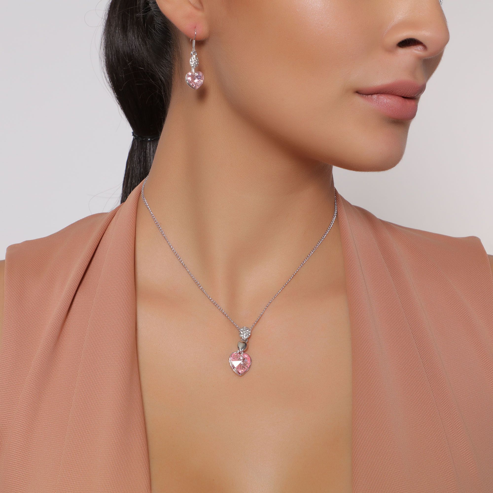 Juego de dije con cadena y aretes en baño de oro blanco de 18 quilates, fino diseño con corazones de cristal en color rosa, detalles plateados e incrustaciones de cristales blancos.