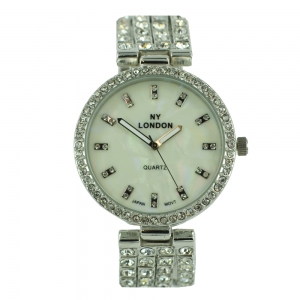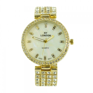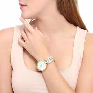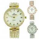 Hermoso Reloj de metal, con baño de oro amarillo, blanco o rosa de 18 quilates, a elegir , elegante diseño con incrustaciones de cristales en color blanco en las correas y contorno de la carátula.