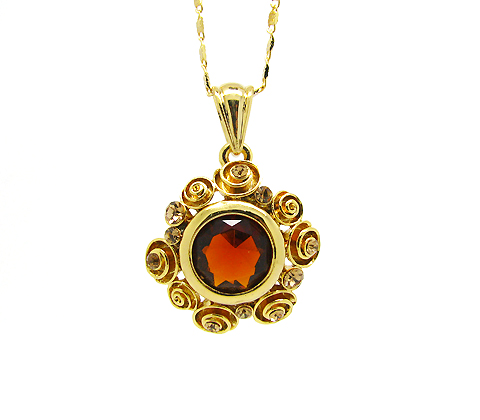 Hermoso dije con fina cadena, en baño de oro amarillo de 18 quilates, con pequeños espirales dorados, cristal ámbar corte circular e incrustaciones de cristales blancos. Fabricado en una estructura de aleación de platino con rodio sin níquel.