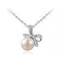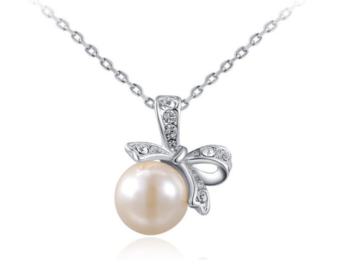 Precioso dije en baño de oro blanco de 18 quilates , diseño de moño con detalle de perla ivory e incrustaciones de cristales en color blanco. Fabricado en una estructura de aleación de platino con rodio sin níquel.