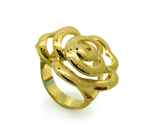 Hermoso anillo, en baño de oro amarillo de 18 quilates, diseño de flor calada, con grabado de grecas. Fabricado en una estructura de aleación de platino con rodio sin níquel.