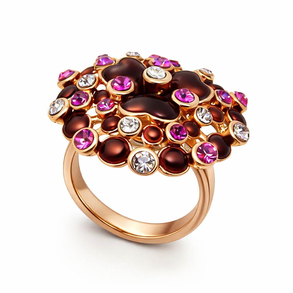 Anillo en baño de oro de 18 quilates, diseño de flor, con acabado esmaltado color vino e incrustaciones de cristales fucsia y blancos. Fabricado en una estructura en aleación de platino con rodio sin níquel. Fabricado en una estructura de aleación de platino con rodio sin níquel.