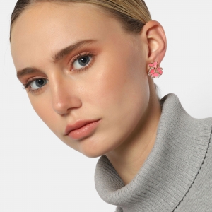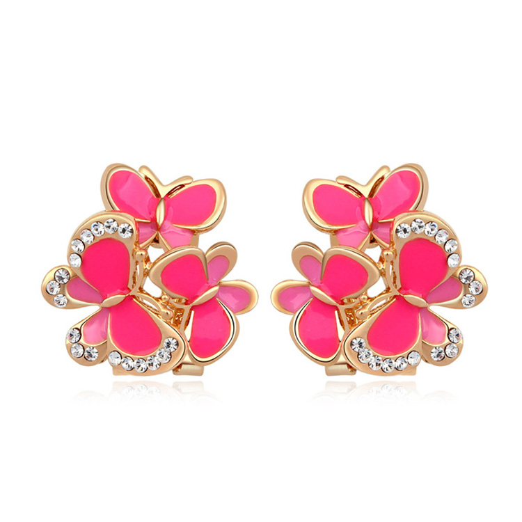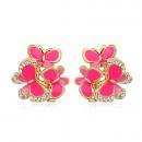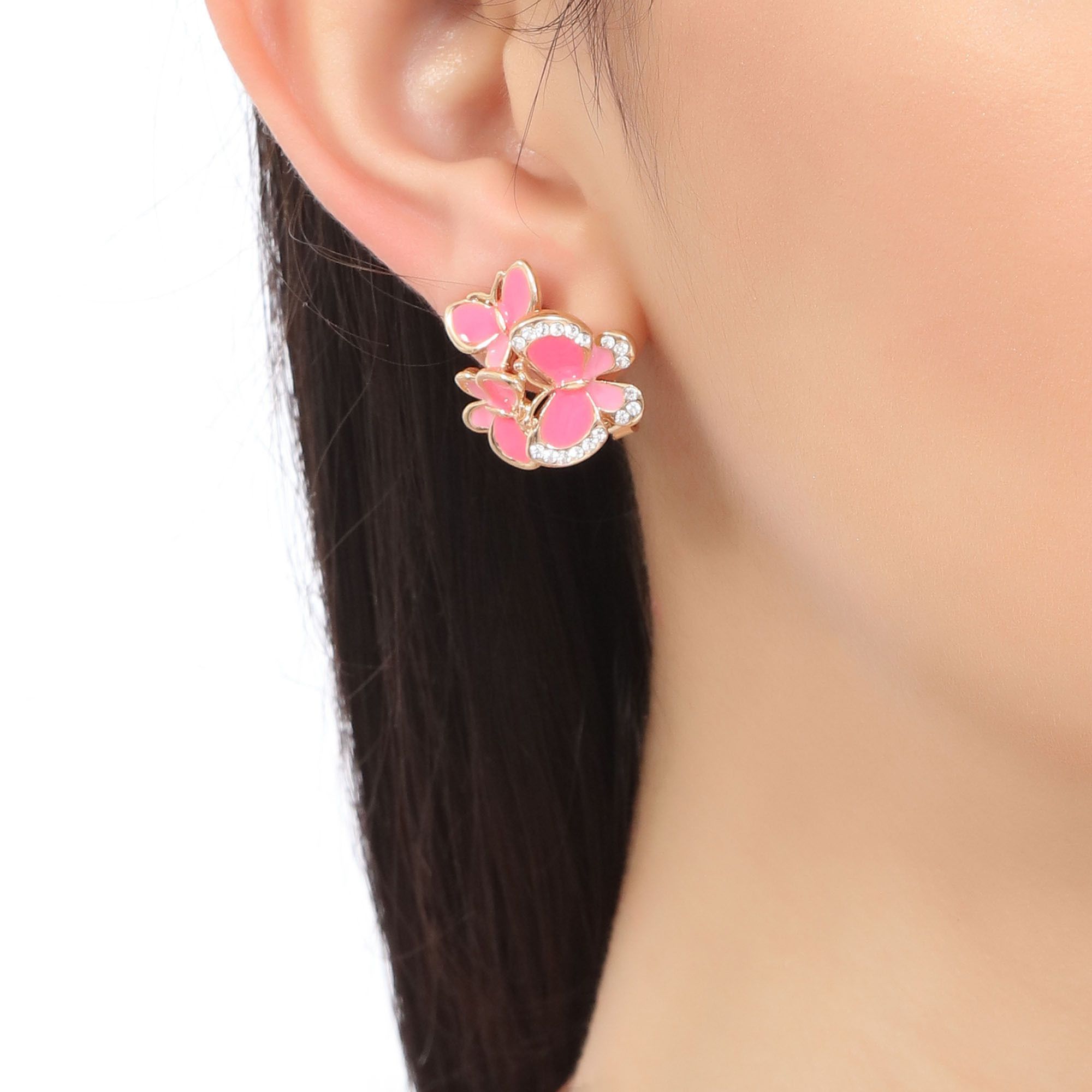 Hermosos aretes en baño de oro amarillo de 18 quilates , diseño de mariposas con esmaltado rosa e incrustaciones de cristales en color blanco. Fabricado en una estructura de aleación de platino con rodio sin níquel.
