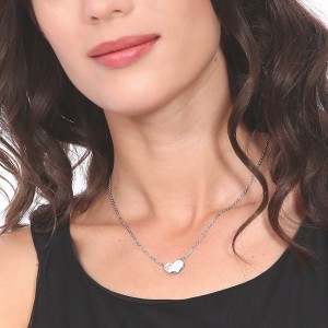 Lindísimo dije con cadena de acero inoxidable en color plateado, diseño de corazón, grabado con palabra "Love" e incrustación de cristal en color blanco.