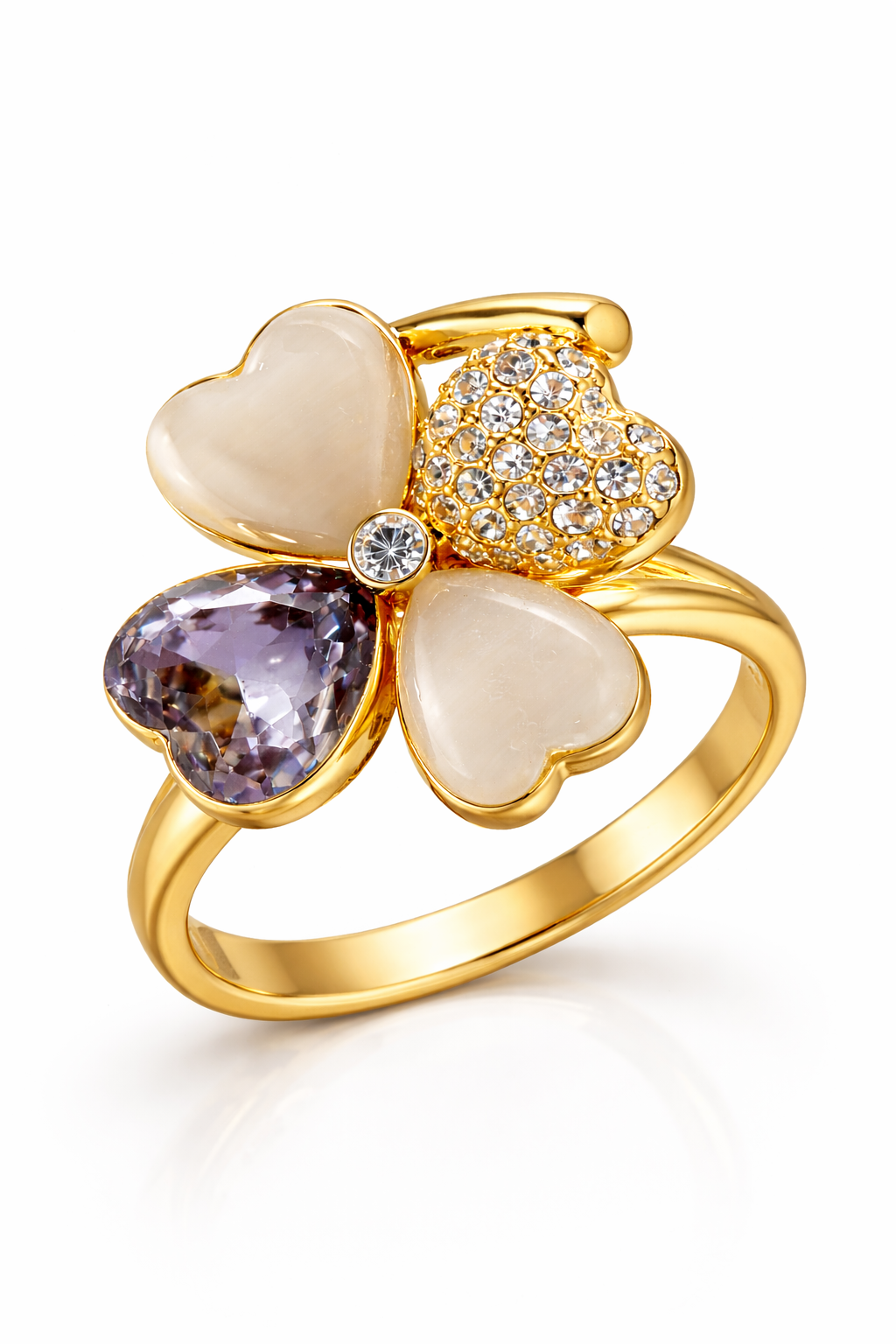 Fino anillo, en baño de oro amarillo de 18 quilates, diseño de flor con piedras blancas, cristal color humo e incrustaciones de cristales blancos. Fabricado en una estructura de aleación de platino con rodio sin níquel.