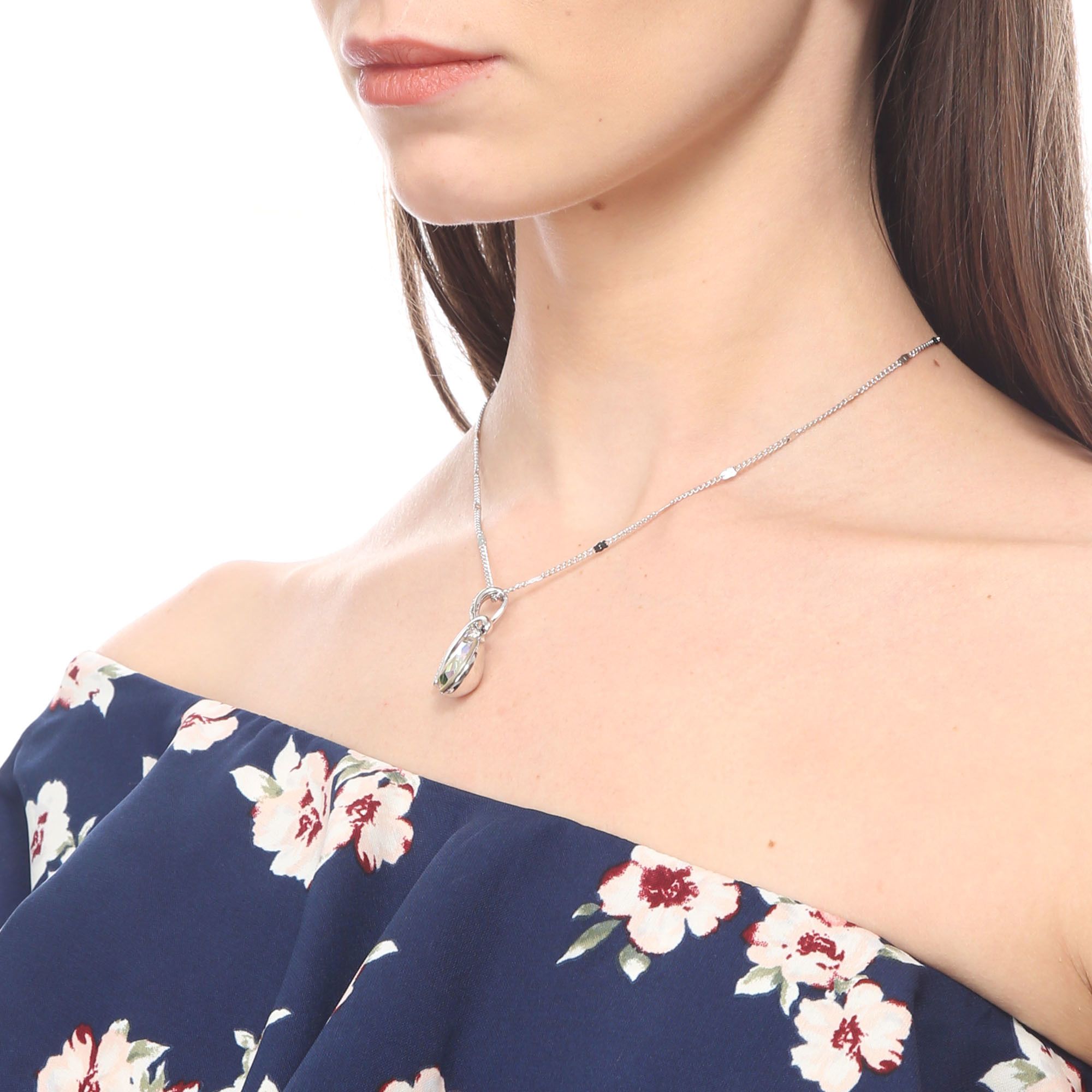 Dije con cadena en baño de oro blanco de 18 quilates , diseño de moño con cristal tornasol corte pera e incrustaciones de cristales en color blanco. Fabricado en una estructura de aleación de platino con rodio sin níquel.