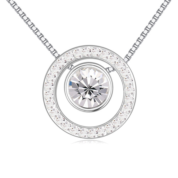 Dije en baño de oro blanco de 18 quilates, diseño de aro con incrustaciones de cristales en color blanco y cristal blanco corte brillante al centro. Fabricado en una estructura de aleación de platino con rodio sin níquel.
