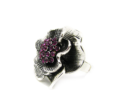 Hermoso anillo, en baño de oro blanco de 18 quilates, diseño de flor en acabado florentino, con pátina negra e incrustación de cristales en color violeta. Fabricado en una estructura de aleación de platino con rodio sin níquel.
