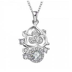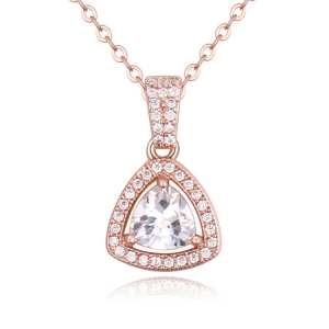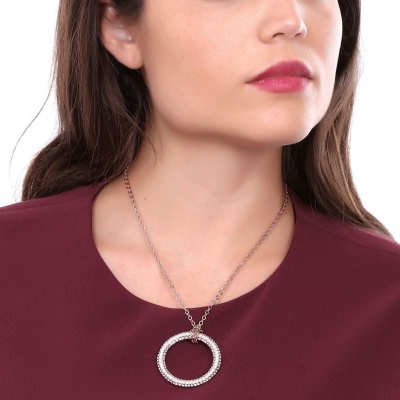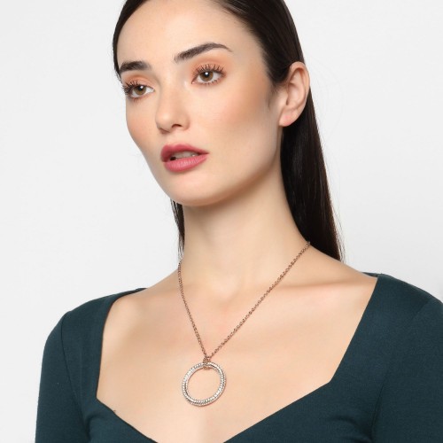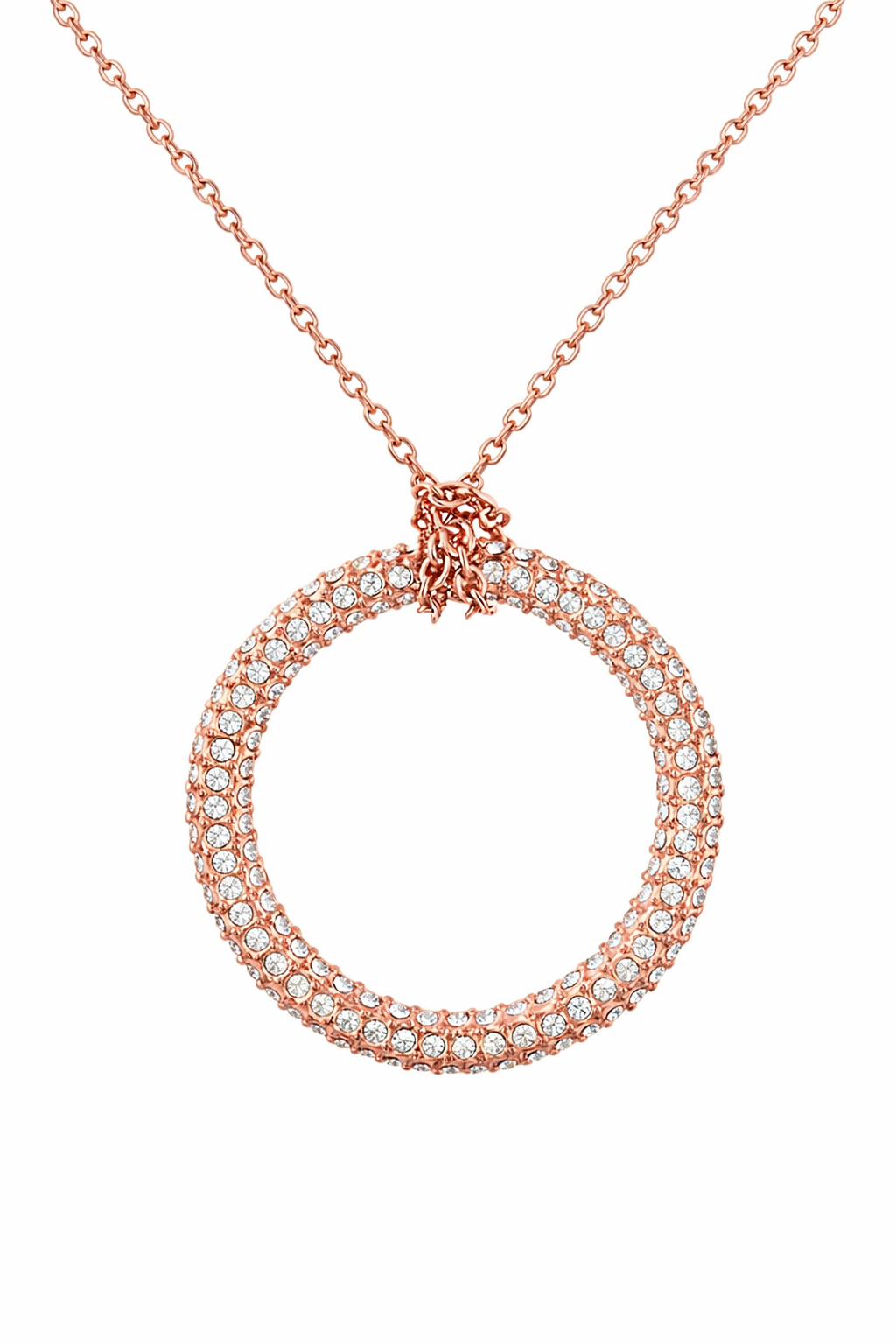 Exquisito dije con fina cadena, en baño de oro rosa de 18 quilates, fino diseño de aro, con incrustaciones de cristales blancos. Fabricado en una estructura de aleación de platino con rodio sin níquel.