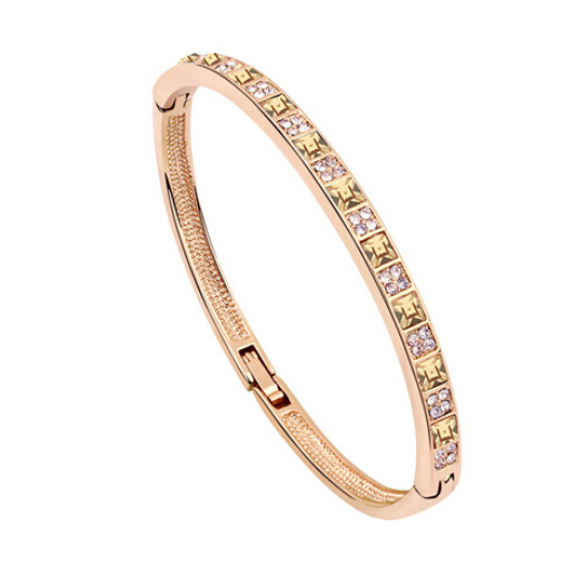 Brazalete en baño de oro amarillo de 18 quilates con cristales corte princesa en color ámbar e incrustaciones de critales blancos. Fabricado en una estructura de aleación de platino con rodio sin níquel. 1. Joyería Hipo alergénica. 2. Incluye cajita de Joyería. 3. Garantía de 30 días por defectos de fabrica.