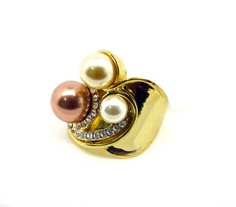 Original anillo, en baño de oro amarillo de 18 quilates, diseño de ondas, con perlas de colores broce, miel y blanco e incrustaciones de cristales blancos. Fabricado en una estructura de aleación de platino con rodio sin níquel.