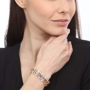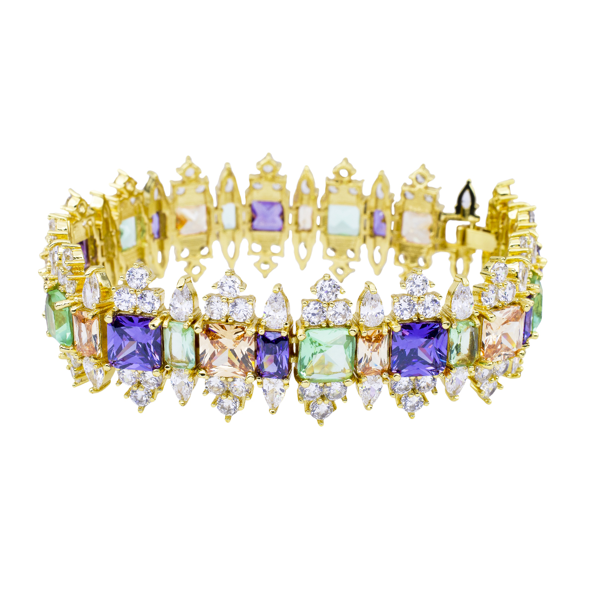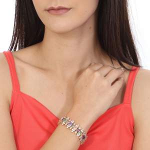Hermoso brazalete en baño de oro amarillo de 18 quilates , elegante diseño con cristales de colores corte princesa y exquisitas incrustaciones de cristales en color blanco. Fabricado en una estructura de aleación de platino con rodio sin níquel.