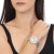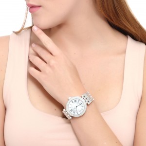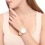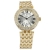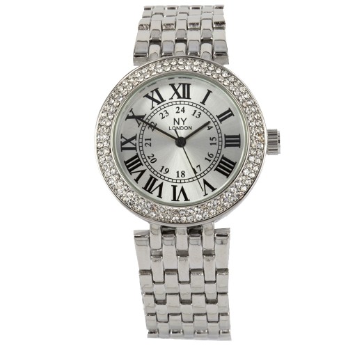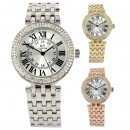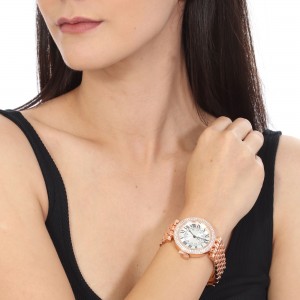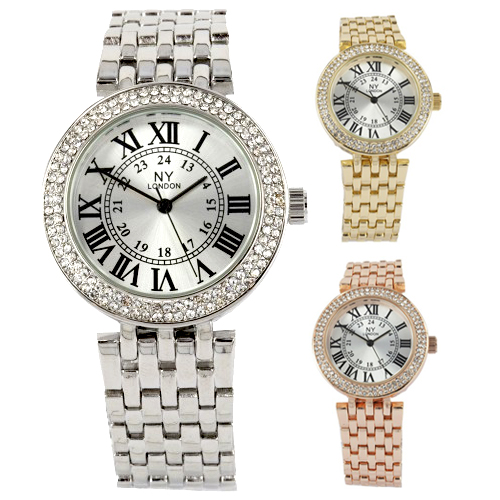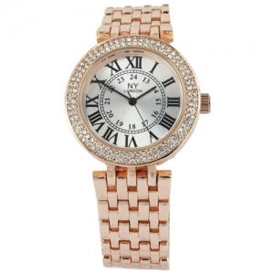 Reloj NY, en baño de oro de 18 quilates disponible en oro amarillo, blanco y rosa, con números romanos en color negro e incrustaciones de cristales blancos.