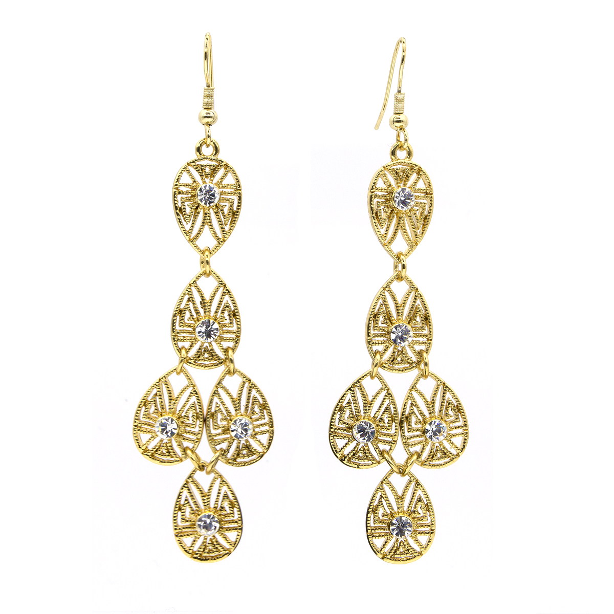 Bellos pendientes en baño de oro amarillo, diseño calado de gotas en cascada e incrustaciones de cristales blancos. Fabricado en una estructura de aleación de platino con rodio sin níquel.