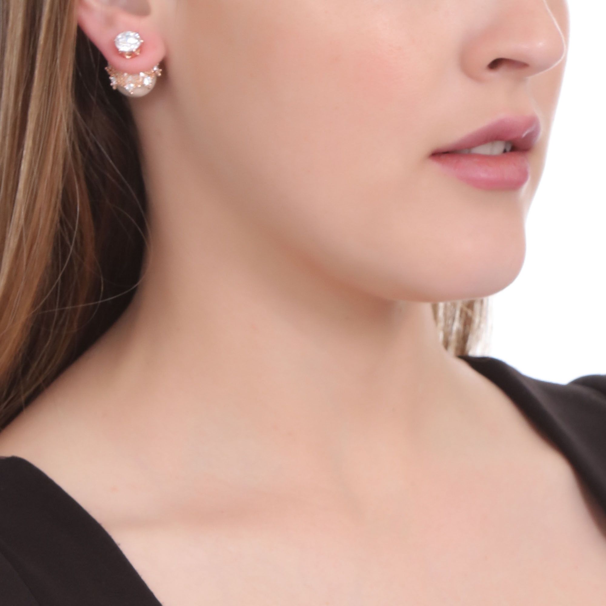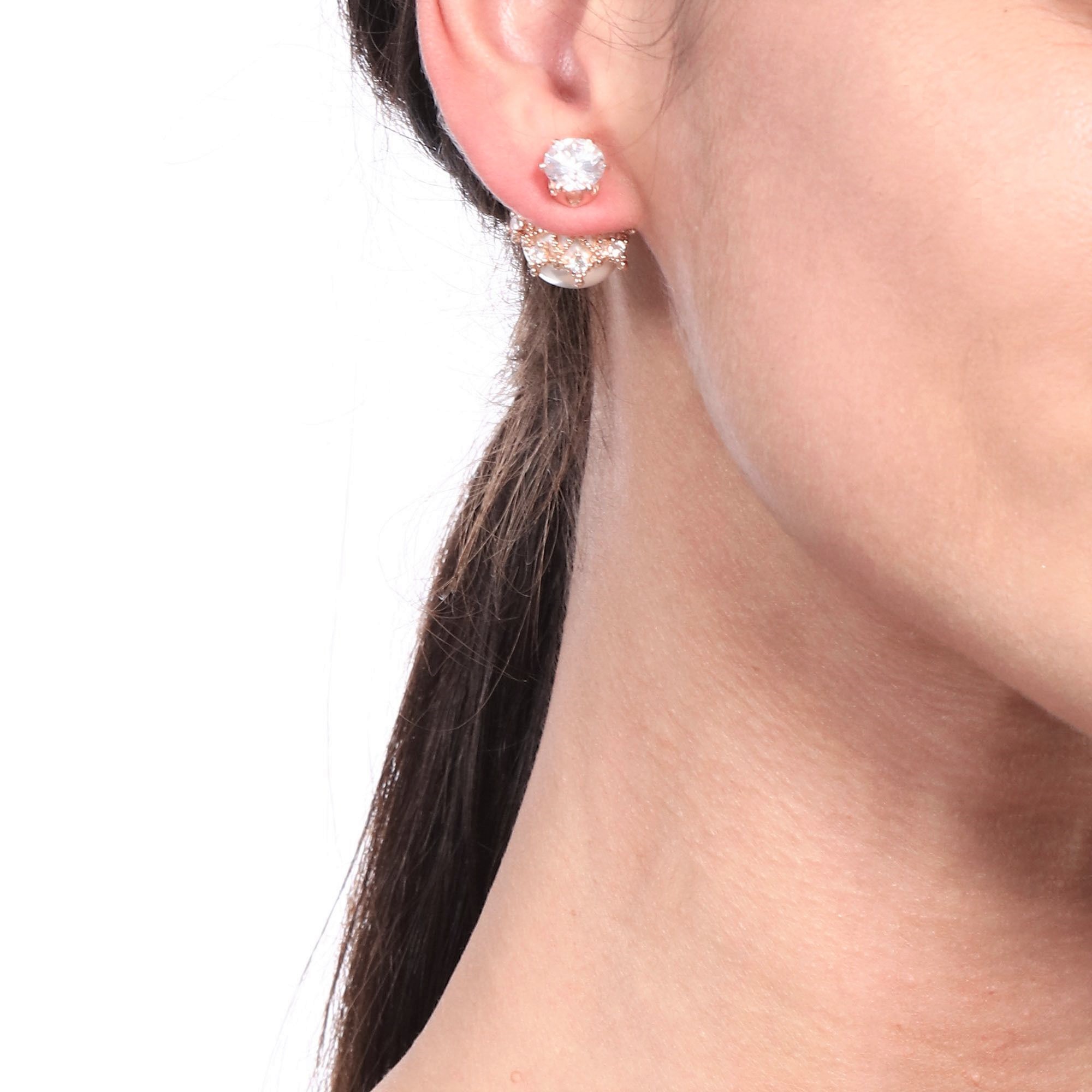 Aretes en baño de oro rosa de 18 quilates con perla blanca e incrustaciones de cristales en color blanco. Fabricado en una estructura de aleación de platino con rodio sin níquel.