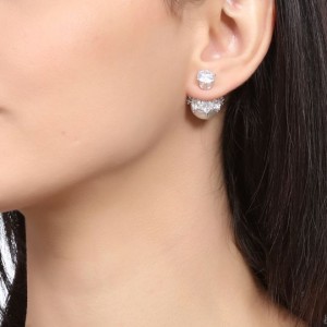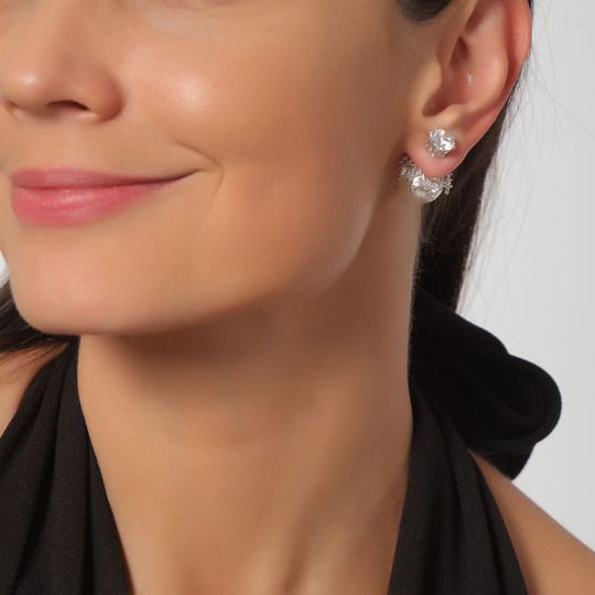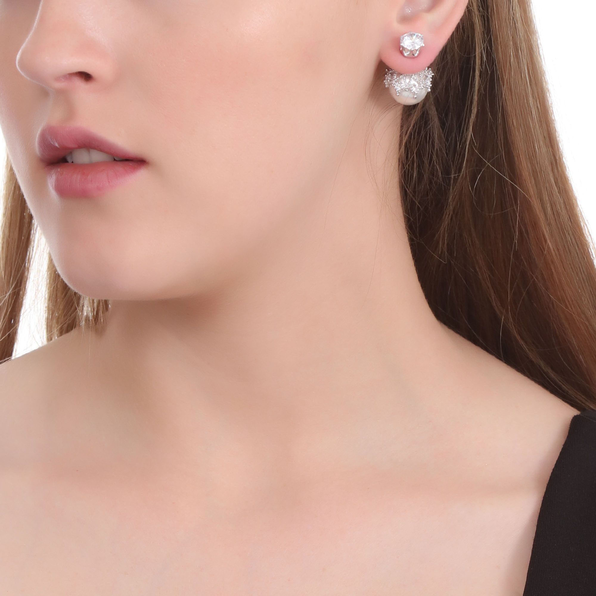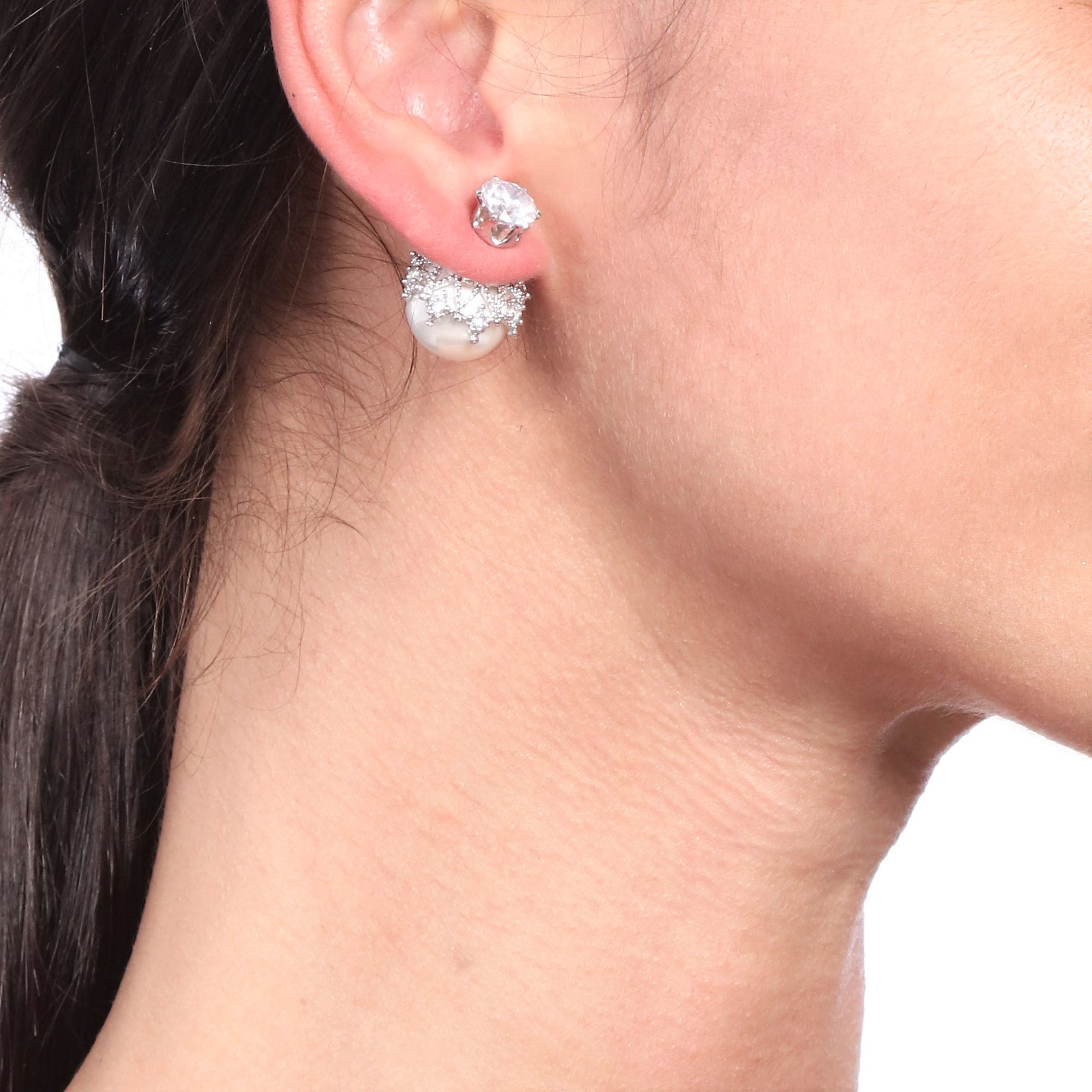 Aretes en baño de oro blanco de 18 quilates con perla blanca e incrustaciones de cristales en color blanco. Fabricado en una estructura de aleación de platino con rodio sin níquel.