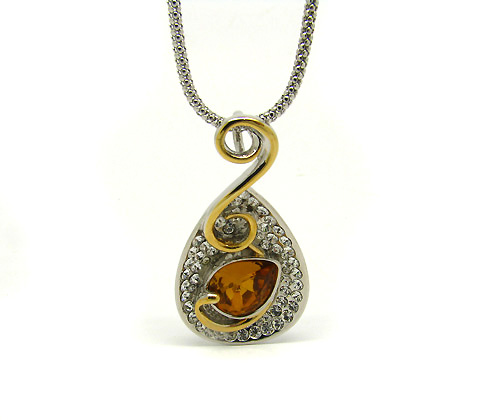 Elegante dije con cadena, en baño de oro blanco y amarillo de 18 quilates, diseño estilo clave de sol, con curvas doradas, cristal ámbar e incrustaciones de cristales blancos. Fabricado en una estructura de aleación de platino con rodio sin níquel.