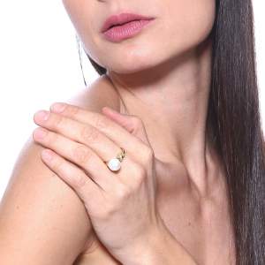 Elegante anillo en baño de oro amarillo de 18 quilates, fino diseño, con detalles en relieve, perla blanca e incrustaciones de cristales en color blanco. Fabricado en una estructura de aleación de platino con rodio sin níquel.