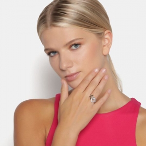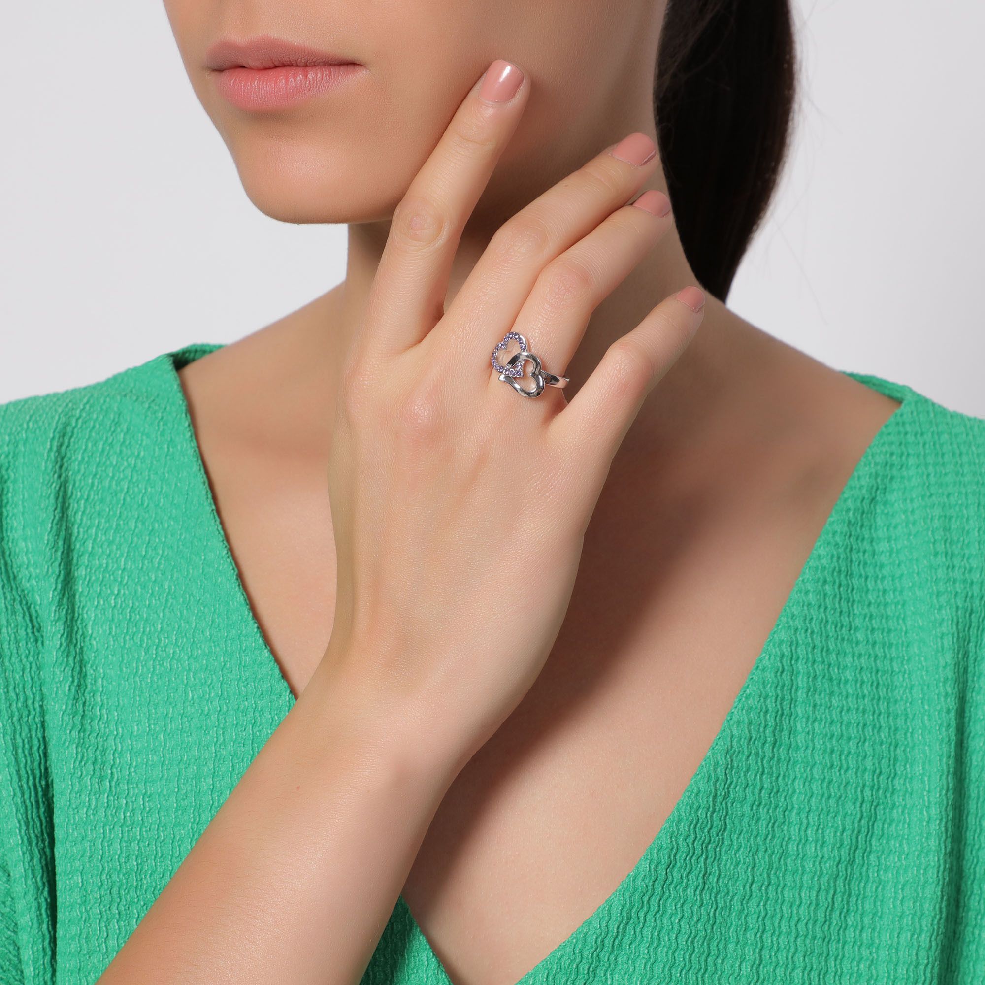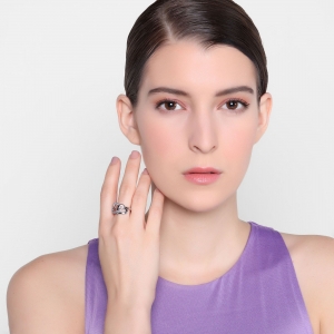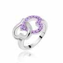 Elegante anillo, en baño de oro blanco de 18 quilates , diseño de corazones entrelazados con incrustaciones de cristales en color morado. Fabricado en una estructura de aleación de platino con rodio sin níquel.