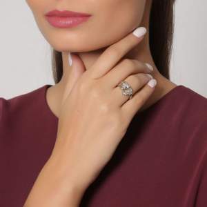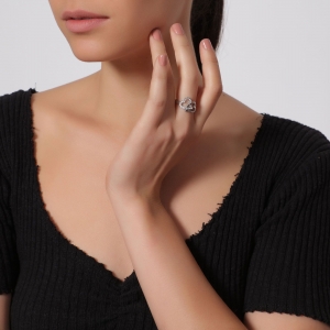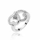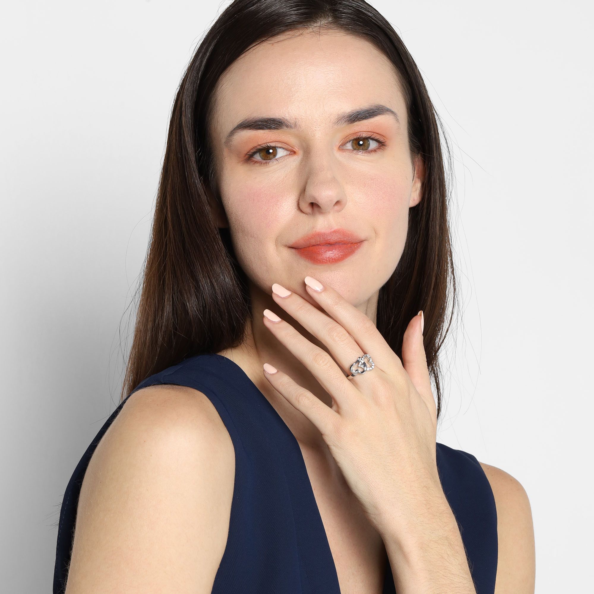 Elegante anillo, en baño de oro blanco de 18 quilates, diseño de dos corazones entrelazados con incrustaciones de cristales blancos. Fabricado en una estructura de aleación de platino con rodio sin níquel.