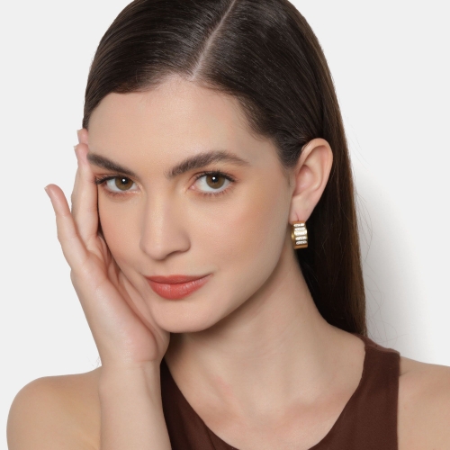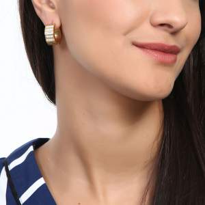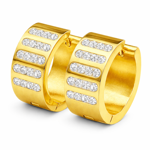 Aretes de acero inoxidable en color amarillo, diseño estilo arracadas, con incrustaciones de cristales en color blanco.