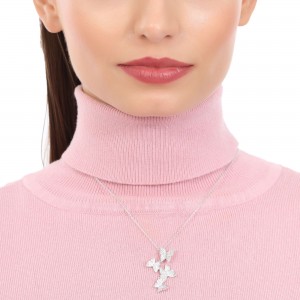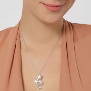 Elegante dije en baño de oro blanco de 18 quilates, fino diseño de mariposas con incrustaciones de cristales en color blanco. Fabricado en una estructura de aleación de platino con rodio sin níquel.
