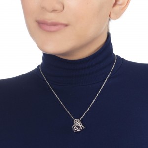 Dije con cadena en baño de oro blanco de 18 quilates, corazón con diseño calado y cristal morado dentro. Fabricado en una estructura de aleación de platino con rodio sin níquel.