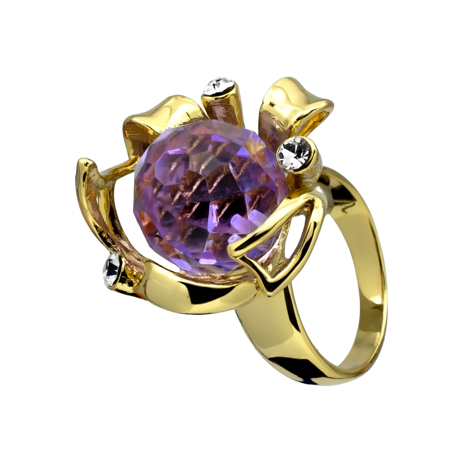 Delicado anillo, en baño de oro amarillo de 18 quilates, con cristal color violeta corte brillante, detalles dorados e incrustaciones de cristales blancos. Fabricado en una estructura de aleación de platino con rodio sin níquel.