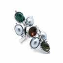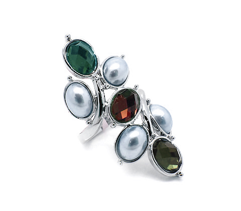 Bello anillo, en baño de oro blanco de 18 quilates, con cristales verde, ámbar y olivo corte oval, perlas blancas e incrustaciones de cristales blancos. Fabricado en una estructura de aleación de platino con rodio sin níquel.