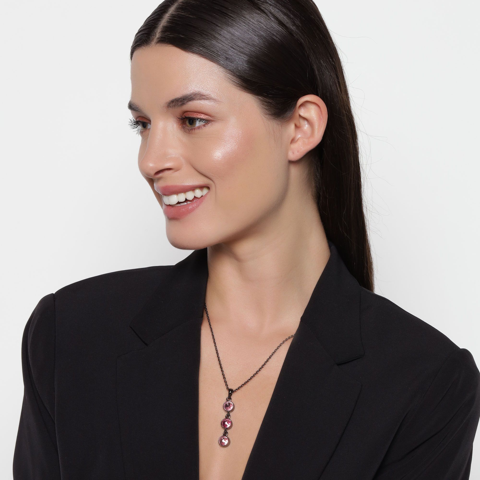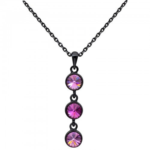 Bonito dije, en baño de oro blanco de 18 quilates, diseño de círculos engarzados, en acabado negro acero brillante y cristales en tonos violeta corte redondo. Fabricado en una estructura de aleación de platino con rodio sin níquel.
