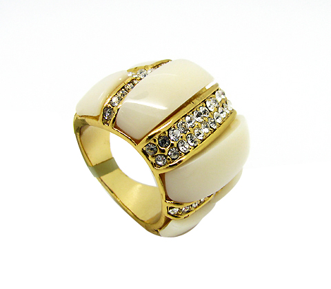 Bonito anillo, en baño de oro amarillo de 18 quilates, con piedras color marfil e incrustaciones de cristales blancos. Fabricado en una estructura de aleación de platino con rodio sin níquel.