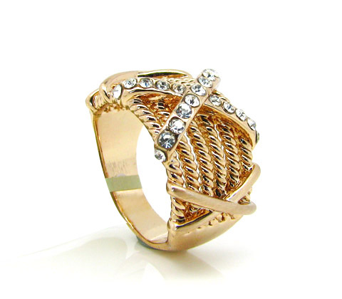 Fino anillo, en baño de oro rosa de 18 quilates, diseño cruzado, con detalles trenzados en relieve e incrustaciones de cristales blancos. Fabricado en una estructura de aleación de platino con rodio sin níquel.