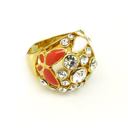 Bonito anillo, en baño de oro amarillo de 18 quilates, con mariposas esmaltadas en coral, blanco y azul e incrustaciones de cristales blancos. Fabricado en una estructura de aleación de platino con rodio sin níquel.
