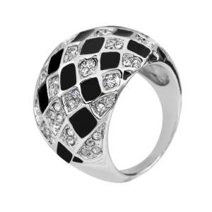 Elegante anillo, en baño de oro blanco de 18 quilates, diseño de rombos con esmaltado negro e incrustaciones de cristales blancos. Fabricado en una estructura de aleación de platino con