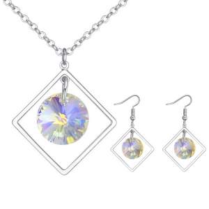 Original conjunto de dije y aretes en baño de oro blanco de 18 quilates, diseño de rombos con cristales tornasol corte brillante.