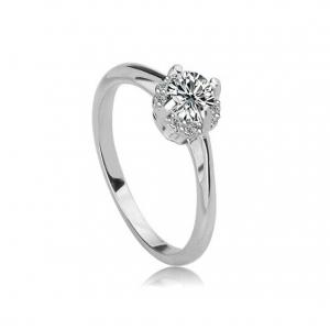 Hermoso anillo, en baño de oro blanco de 18 quilates, fino diseño, con incrustación de cristal en color blanco corte brillante. Fabricado en una estructura de aleación de platino con