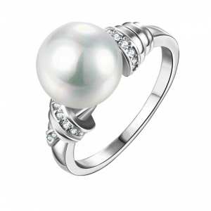 Elegante anillo, en baño de oro blanco de 18 quilates, fino diseño, con detalles en relieve, perla blanca e incrustaciones de cristales en color blanco. Fabricado en una estructura de